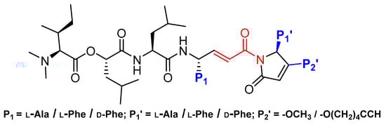 Gallinamide was reconstructed with altered amino acid sequence at P1, P1′, and P2′ positions. The acrylic group, the Michael acceptor, is shown in red.