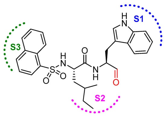 In another interesting study, Yasuma et al. developed a library of compounds by varying the amino acid substituents at P1, P2, P3 position of the inhibitor and carried out a thorough SAR study [21]. Their study revealed that the configuration of the stereogenic center (S-configuration is favored over R-configuration) at the P1 position, and not the steric factor, was key to the inhibitory efficacy. Apparently, the substituent at P1 position does not interact with S1 position residues; rather, proper stereogenicity allows the placement of the inhibitor in vicinity of the catalytic cysteine residue for interaction. S2 subsite of cathepsin L, on the other hand, preferred a hydrophobic and moderate-size group; α-branched alkyl chains but not the bulkier groups like phenylalanine was favorable. Further, the S3 subsite showed a preference for hydrophobic and bulky moieties such as 1- and 2-naphthalenylsulfonyl substituents. Among synthesized compound, N-(1-naphthalenylsulfonyl-l-isoleucyl-l-tryptophanal (IC50 = 1.9 nM, 789-fold selective over cathepsin B; Figure 13) attenuated the release of Ca2+ and hydroxyproline from bone in an in vitro bone culture system and further restricted bone loss in ovariectomized mice dosed orally.