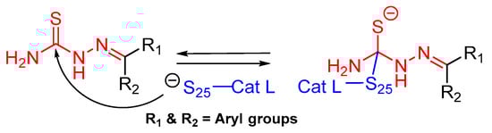 The thiosemicarbazone moiety was first recognized as a relevant covalent and reversible warhead of cathepsin L homologous enzyme cruzain, a protease from T. Cruzi. The mechanism of inactivaction involves the formation of a transient covalent bond with the catalytic Cys residue (Figure 19) [148]. In an interesting study, Kishore Kumar et al. first utilized this idea and synthesized a small library of compounds in which the most active class of inhibitors were comprised of one meta-bromo substituted aryl ring along with another one with optimally substituted functionalities [127]. The inhibitor places itself in the active site cleft of cathepsin L where meta-bromo substituted aryl ring occupies the S2 site and thiosemicarbazone motif lies near the active site cysteine.