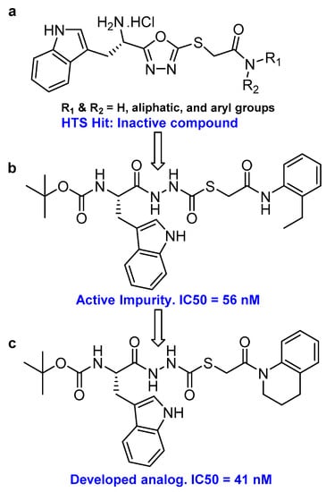 In an effort to discover small molecule inhibitors of cathepsin L, Myers et al. performed high throughput screening (HTS) of the NIH Molecular Libraries Small Molecule Repository (MLSMR); they identified 2,5-disubstituted oxadiazoles (Figure 20a) as potent hit compounds [129]. Surprisingly, upon synthesis and purification of the putative inhibitory lead compounds, a complete loss of activity was observed. The authors then investigated the compounds’ integrity from NIH MLSMR library by LC-MS; this showed the presence of additional impurities. To trace back the active impurity, the authors hypothesized the presence of impurities resulting from an acid-catalyzed ring-opening reaction of thiocarbazate. The resulting azapeptides was likely the active pharmacophore that inhibited enzyme via acylation of active site Cys; this was validated by synthesis of azapeptides and performing the enzyme assay [149]. The (S)-stereoisomer of newly synthesized compound (Entry 25, Table 2; Figure 20b) indeed attenuated the activity of cathepsin L with an IC50 value of 56 nM. In follow up studies, the authors further developed a series of compounds with structural diversity and performed a computational analysis to recognize the basis of potent enzyme inhibition [130,150] One of the thiocarbazate analogs developed this way (Figure 20c) showed improved potency over the parent compound. Molecular modeling studies performed with parent compound (Entry 25, Table 2) in complex with papain indicated that indole motif preferably bound to S2 subsite, -NHBoc group engaged in favorable hydrophobic interactions within the S3 subsite and 2-ethylphenyl anilide extended to S1′ pocket. To further probe the importance of thiocarbazate moiety, the authors synthesized compound containing oxocarbazate (Entry 26, Table 2) and azapeptide (Entry 27, Table 2) motifs. The oxocarbazate showed a fairly improved IC50 value (7 nM) towards cathepsin L, whereas the azapeptide was at best only a modest inhibitor (IC50 = 3 µM). Consistently, the binding mode of oxocarbazate exerted similarity to that of thiocarbazate when investigated by molecular modeling studies [150].