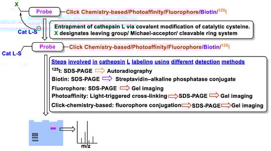 Ubiquitous expression of human cathepsin L in most human tissues possesses a significant challenge in targeting this enzyme for therapeutic development. This problem is further exacerbated with recent findings that alternative spliced isoforms could exist at distinct cellular locations (e.g., nucleus, cytosol, and ECM space) [37,38,151]. While several unique functional roles of cathepsin L are known, it has also been reported that some of its function can also be accomplished by other members of the cathepsin family (i.e., functional redundancy); for example, both cathepsin L and B can mediate a mutually compensatory role in the inflammatory response signaling pathways [152]. In this regard, accurate function of cathepsin L must be first determined in different cell types individually before considering significant investment in drug development. Since the function of an enzyme, such as cathepsin L, depends primarily on its activity profile and given that the activity profiles of differentially processed cathepsin L isoforms may be very different, probes capable of reporting accurate activity status in different cell types (and cellular location) are anticipated to advance our understanding if cathepsin L biology. Over the years, the concept of Activity-Based Probes (ABPs) has emerged as a valuable chemical biology tool for monitoring the enzyme activity (not just the expression profile alone) in cells at the proteome levels [153,154,155,156].
