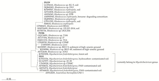 The following bacterial strains—Mycolicibacterium frederiksbergense IN53 (formerly Mycobacterium frederiksbergense IN53), Rhodococcus erythropol is IN129, and Rhodococcus sp. IN306 were used in this study. They came from the hydrocarbon-degrading microbial collection of the Department of Microbiology (at the Oil and Gas Institute–National Research Institute, Krakow, Poland) and were isolated from temperate (IN129 and IN53) and desert (IN306) hydrocarbon-exposed soils. In addition, IN53 was previously tested alone or as a member of a hydrocarbon-degrading mixed culture [51]. Diagnostic features of the strain were determined based on microscopic observations, morphology, growth on selective agar media, and biochemical profile (API-Coryne test, bioMerieux). The strains were phylogenetically identified by sequencing of gene encoding for 16S rRNA as described previously [39,85].