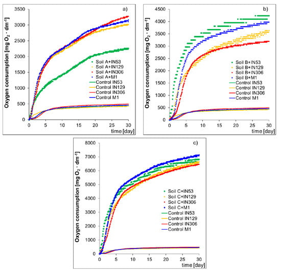 Oxygen consumption by microorganisms Mycolicibacterium frederiksbergense IN53, Rhodococcus erythropolis IN129, Rhodococcus sp. IN306 and mixed culture M1 to degrade (a) PCBs (sterile Soil A contaminated PCB), (b) TPH (sterile Soil B contaminated TPH), and (c) PCBs and TPH (sterile Soil C contaminated PCB and TPH) in the biodegradation process. Control-sterile uncontaminated “pure” soil inoculated with bacterial strains and mixed culture.