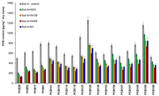 PCB biodegradation potential of studied bacterial strains and mixed culture in sterile soil contaminated solely with PCBs (Soil A) was assessed by chromatographic analyses. Figure 3 and Table S1 present the content of studied PCB congeners in the PCBs contaminated soil (Soil A) before and after 30-day inoculation with bacterial strains: Mycolicibacterium frederiksbergense IN53, Rhodococcus erythropolis IN129, Rhodococcus sp. IN306, and mixed culture M1.
