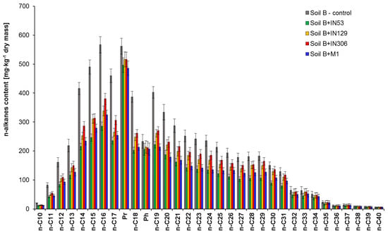 A satisfactory effect of n-alkanes biodegradation as a result of Soil B inoculation is proven by indices of C17/Pr and C18/Ph biodegradation, which were substantially reduced (Table S2). The highest reduction was recorded during inoculation with the IN53 strain (C17/Pr from 0.818 to 0.473 and C18/Ph from 1.675 to 0.985) and with mixed culture M1 (C17/Pr from 0.818 to 0.522 and C18/Ph from 1.675 to 1.029).