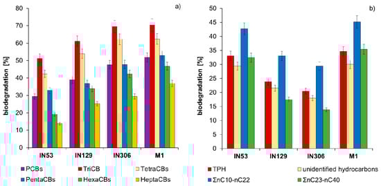 Comparison of biodegradation (%) in sterile Soil C contaminated with both PCBs and TPH after inoculation with Mycolicibacterium frederiksbergense IN53, Rhodococcus erythropolis IN129, Rhodococcus sp. IN306, and mixed culture M1: (a) polychlorinated biphenyls; (b) petroleum hydrocarbons (repetition number n = 8–10, p < 0.05).