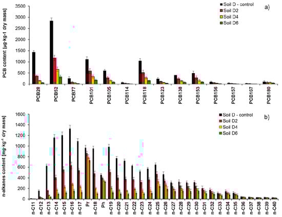 Comparison of identified pollutants content in the studied soil (Soil D) and after 2 (Soil D2), 4 (Soil D4), and 6 (Soil D6) months of inoculation with mixed culture M1 is presented in Figure 6: (a) PCB congeners, (b) n-alkanes. As a result of Soil D inoculation with mixed culture M1 after 6 months of the process duration, the content of identified PCBs was reduced from 8752 µg/kg of dry mass to 1357 µg/kg of dry mass (84.5%). Results of Soil D2 chromatographic analyses show that the PCB28 content was reduced from 1396 µg/kg to 371 µg/kg of dry mass (73.4%). The tetraCBs content (PCB52 and PCB77) decreased by 56.4 and 65.6% respectively. The biodegradation of pentaCBs was similar and ranged from 49.8 to 53.6%. In this case, the di-ortho PCB101 was an exception, in which biodegradation degree was much lower and after 2 months of the process amounted to 45.2%. Di-ortho congeners turned out to be most durable among hexaCBs, in which content decreased by 40.1% (PCB138) and 39.3% (PCB156). The other congeners having six chlorine atoms were reduced by 44.8 to 45.3%. The PCB180 congener turned out to definitely be the most difficult to degrade, which has seven chlorine atoms and a di-ortho spatial structure (29.7%).