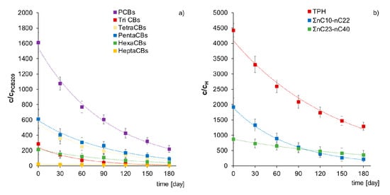 The analysis of non-linear regression using Equation (2) enabled determination of the first-order biodegradation constant (k) and the correlation coefficient (r2) defining the measuring points fit to theoretical curves of the biodegradation process: PCBs, TriCB, TetraCBs, PentaCBs, HexaCBs, HeptaCBs, TPH, ΣnC11–nC22, and ΣnC23–nC40.