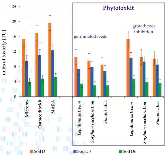 Comparison of toxicity test results expressed in toxicity units (TU) from non-sterile soil during inoculation with mixed culture M1 (ex-situ prism method) (n = 3, p < 0.05): Soil D—raw soil; Soil D3—soil after 3 months; Soil D6—soil after 6 months.