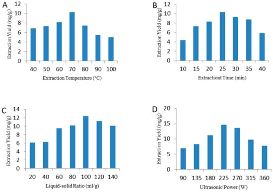 Effects of a different extraction temperature (A), extraction time (B), liquid-solid ratio (C), and ultrasonic power (D) on the extraction yield.