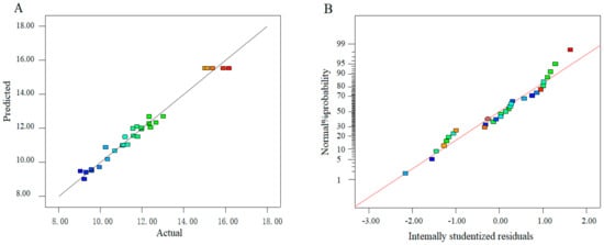 The predicted values obtained from the model were in agreement with the experimental result (Figure 2A). Meanwhile, the normal probability plots of residuals indicate no serious deviation from normality (Figure 2B) [39].