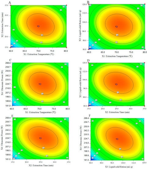 Contour plots showing the significant interactions of the extraction parameters. Extraction temperature and extraction time (A), extraction temperature and liquid-solid ratio (B), extraction temperature and ultrasonic power (C), extraction time and liquid-solid ratio (D), extraction time and ultrasonic power (E), and liquid-solid ratio and ultrasonic power (F).
