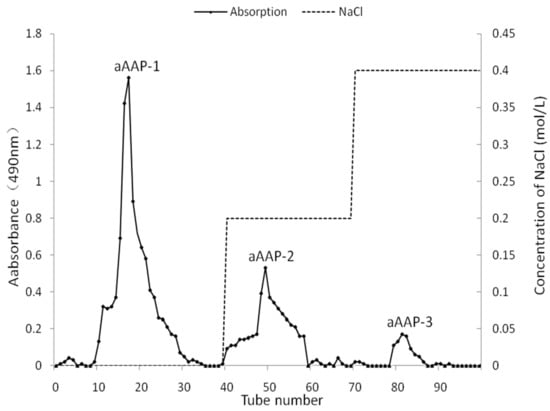 After the removed protein was concentrated, dialyzed, and lyophilized, the yield ratio of cAAP was about 80.68%. aAAP was precipitated from cAAP with CTAB and purified by using ion exchange chromatography with DEAE Purose 6 Fast Flow column (Figure 4). The yield ratio of aAAP was 62.71%. The yield ratios of aAAP-2 and aAAP-3 were lower than that of aAAP-1 (15.16%). Only aAAP-1 was further studied.