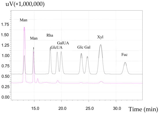 The HPLC chromatographs of monosaccharide standard and aAAP-1 are shown in Figure 6. These show that aAAP-1 was an acidic heteropolysaccharide mainly composed of Man, GlcUA, Glc, Gal, and Xyl, with molar ratio of 80.63:9.88:2.25:1:31.13. The aldehyde acid of aAAP-1 was glucuronic acid but not galacturonic acid [44], which is consistent with Zhang et al. [45]. The monosaccharide composition and molar ratio of aAAP-1 was different from other polysaccharides extracted from A. auricula-judae [26,46], which indicated that the differences in the extracting conditions, separation, and purification influence the composition of polysaccharides from the same resource.