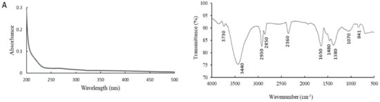 The ultraviolet-visible (UV-vis) spectrum of aAAP-1 is shown in Figure 7A, showing only an absorption peak at 200 nm and without absorption peaks at 260 and 280 nm, indicating that the aAAP-1 did not contain nucleic acids and proteins [47]. The FT-IR spectrum of aAAP-1 was scanned in the range 400–4000 cm−1 and is presented in Figure 7B. A weak peak near 3730 cm−1 indicated a free intermolecular hydroxyl (–OH), the broad and strong absorption peak at 3440 cm−1 (3500–3100 cm−1), which could be assigned to stretching vibrations of intramolecular hydroxyl (–OH) groups [48]. The absorption peaks at 2930 and 2850 cm−1 (2800–3000 cm−1) were formed by the chemical bond (C–H) stretch [49], and the peak at 2360 cm−1 was the C–H transiting angle [50]. These are typical characteristics of polysaccharides. Uronic acids were evidenced by the strong absorbance band at 1650 cm-1 (C–O) and two bands at 1480 and 1380 cm−1 (O–C=O) [3,51]. In addition, the absorption peaks around 1070 cm−1 (1150-1050 cm−1) were ascribed to C–O–C and C–O–H vibration, indicating the existence of pyranose. The characteristic absorption bands at 841 cm−1 suggested the existence of β-configurations of saccharide units in aAAP-1 [39]. The S=O stretching is characterized by no absorbance band at 1240 cm-1, proving that aAAp-1 is not a sulfate ester [26].