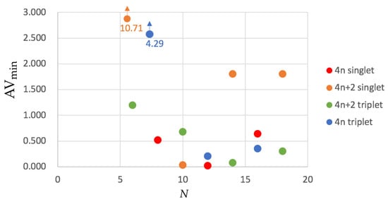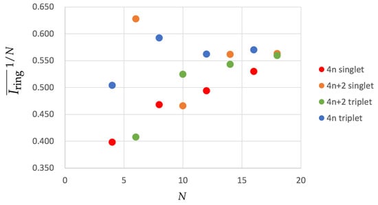 Values of for the annulenes series against the number of C atoms (N) for different singlets and triplets. The species have been divided according to the number of electrons (4n and 4n + 2) and the spin multiplicity (singlet and triplet).