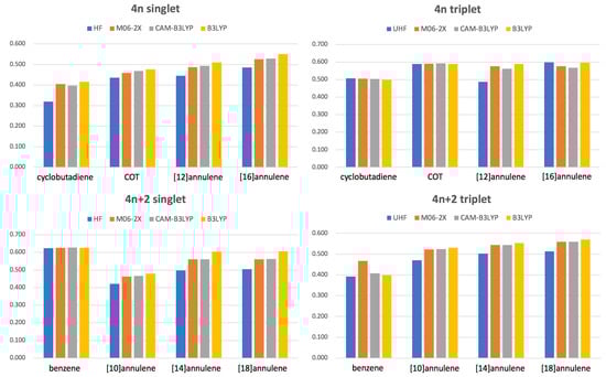 values for different methods are collected in Figure 5. Our results confirm that in the large majority of cases B3LYP and HF are giving the most and the less aromatic species, respectively, among the DFA studied. In some cases (see, singlet benzene, triplet cyclobutadiene or triplet COT) there are no large differences among the DFAs because these species do not suffer from the delocalization error. However, in many other cases (see singlet annulenes larger than benzene) B3LYP clearly overestimates electron delocalization, sometimes even favoring a different geometrical arrangement of the atoms in the ring that permits larger electron delocalization (see Section 3.2). As expected, HF tends to overestimate electron localization whereas CAM-B3LYP and M06-2X provide very similar results lying between HF and B3LYP values. There is only two exceptions to this rule: the triplet states of benzene and [16]annulene. Unlike other DFAs and HF, the M06-2X geometry optimization of triplet benzene leads to a non-planar structure that does not correspond to the AQ structure [17] and, therefore, it is not as antiaromatic as one would expect. A careful examination of the potential energy surface of the triplet state of benzene confirms that M06-2X does not identify the AQ conformation as a minimum of energy at this level of theory. In the case of [16]annulene, the exception is that HF value is actually larger than that of CAM-B3LYP or M06-2X because, according to HF, the structure is more planar than predicted by these DFAs.