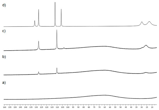 Then, the reactivity of the low valent Fe0 and FeI oxidation states in the reaction medium was investigated. Following one of our recent procedures, reduction of FeII into a distribution of Fe0 and FeI species was performed, by fast trans-metalation between FeCl2 and PhMgBr (2.0 equiv.) at room temperature [40,41]. After 10 min, 1.0 equiv. of MesMgBr was added. The 1H-NMR spectrum showed no signal in the 100–150 ppm area, which attests to the absence of any Mes-FeII species, which shows that all the starting FeII was reduced by PhMgBr (Figure 3a).
