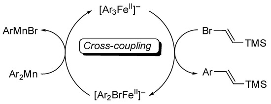 In summary, various functionalized bis-(aryl)manganese species have been readily prepared in one-pot conditions from the corresponding aryl bromides by inserting magnesium in the presence of LiCl and in situ trans-metalation with MnCl2 in THF at −5 °C within 2 h. These bis-(aryl)manganese reagents have been allowed to undergo smooth iron-catalyzed cross-couplings using 10 mol% Fe(acac)3 and various functionalized alkenyl iodides and bromides at 25 °C for 1 h. Mechanistic investigations carried out by 1H-NMR showed that ate-iron(II) species [Ar3FeII]− are formed by trans-metalation of the bis-(aryl)manganese reagent with the iron catalyst, and that they can react with alkenyl bromides to afford the expected cross-coupling product. Low-valent Fe0 and FeI oxidation states can also be formed by the reduction of the ate-iron(II) catalyst under these conditions. This leads to the sacrificial reduction of the alkenyl electrophile via an off-cycle pathway, which partly regenerates the FeII oxidation state, where the latter is able to enter a new catalytic cycle.