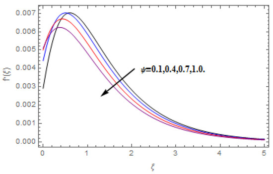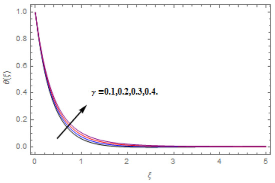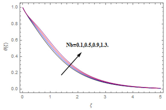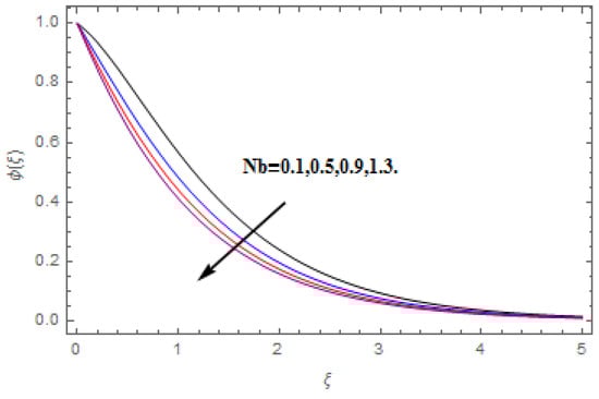 The aim of this section is to visualize variations in velocities, temperature, concentration, Nusselt number, and skin friction coefficient due to involved parameters, like magnetic field (), porosity (), velocity slip (), Eckert number (), heat source/sink (), thermophoresis (), Prandtl number (), Lewis number (), and Brownian motion () developed during the nanofluid flow that are displayed in Figure 4, Figure 5, Figure 6, Figure 7, Figure 8, Figure 9, Figure 10, Figure 11, Figure 12, Figure 13, Figure 14, Figure 15, Figure 16, Figure 17 and Figure 18. Figure 4 and Figure 5 depict the reducing influence of on and . The increasing causes deterioration in momentum boundary layer thickness and velocity profiles. relates with the Lorentz force theory. The Lorentz force always creates conflicting force to the flow of fluid and decays motion of the fluid particles. Accordingly, the escalating magnetic force declines the fluid velocity. The escalating declines and is depicted in Figure 6 and Figure 7. The porous media usually performs opposite behavior to the fluid flow. With an increase in the porous media, the fluid particles motion reduces and, thus, the fluid velocity diminishes. Therefore, the growing estimations of diminishes and . Figure 8 and Figure 9 depict the escalating diminishes and . The velocity slip parameter always performs a reverse impact on velocity profiles. The corresponding boundary layer thickness declines by , which deescalates and . Figure 10 depicts the impression of on . It is witnessed that the escalating escalates . The influence of on is demonstrated in Figure 11. The heat source/sink plays like heat producer. As the parameter estimations intensify, the fluid particles temperature heightens. For that reason upsurges. Figure 12 portrays the effect of on . It is used for extremely fast compressible flow. The positive Eckert number represents the freezing of wall and, as a result, the convection of heat transmission to the fluid is augmented. Figure 13 shows the consequence of on . makes the association of fluid viscosity with thermal conductivity. The fluids have high thermal conductivity with large , while the impact is reverse for higher . Hence, the escalating estimations of deescalates . Figure 14 illustrates the effect of on . Higher Brownian motion induces the random acceleration of the fluid particles. Extra energy is generated because of this random acceleration. Therefore, the thermal rise is reported. Figure 15 presents the impression of on . In the thermophoresis phenomenon, tiny fluid particles are forced back from those in the warmer to the cold surface. As a result, the fluid particles returned from those in the warmed surface and the thermal curve then increased. The outcome of and on are shown in Figure 16 and Figure 17. The higher estimations of shows reverse impact on . Figure 17 illustrates the rising impression of on . Figure 18 demonstrates the influence of on . is the correlation of mass diffusion to fluid thermal conductivity. The increasing causes thickness of the concentration layer, which consequently escalates the concentration profile.
