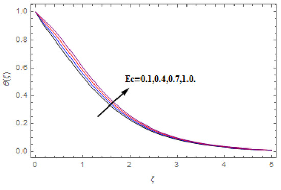 - Increasing Eckert number, thermophoresis, Brownian motion, magnetic, and heat source/sink parameters perform reducing behavior on temperature profile while the Prandtl number performs opposite conduct on temperature profile.