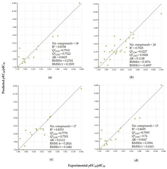 Scatter plots of the experimentally measured property and predicted activity obtained for four regression relations Equations (1), (2), (4), and (5) along with the statistical parameters for (a) agonist monazoles (thiazole/oxazole); (b) agonist diazoles (imidazoles and benzimidazole); (c) antagonist diazoles (imidazoles and benzimidazole); and (d) antagonist triazoles.
