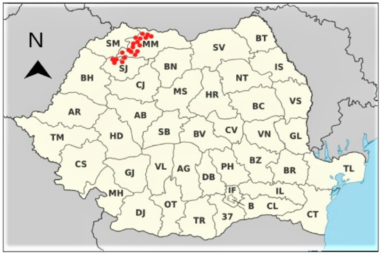 Soil, cane, and leave samples of grapevine were collected from Baia Mare, Baia Sprie and surrounding areas (Simleul Silvaniei) (Figure 1) during the vegetation period in May 2012. Soil samples were collected at the depth of 0–20, 20–40, 40–60 and 60–80 cm at the vineyard. Grapes of Feteasca alba, Feteasca regala, and Italian Riesling varieties were sampled one week before harvesting in August 2012. Roots (diameters <2.5 mm and >2.5 mm), canes (50–70 cane pieces of 25 cm), and leaves (50–70 fully-developed leaves from the middle part of the one-year old cane) were also collected. After removing damaged plant materials, samples were placed in sealed plastic bags and were immediately transported to the laboratory. Plant materials and soil samples were carefully processed to avoid chemical and physical interactions and analyzed by Inductively Coupled Plasma Mass Spectrometry (ICP-MS) Waltham, Massachusetts, SUA (see the Supplementary Materials).