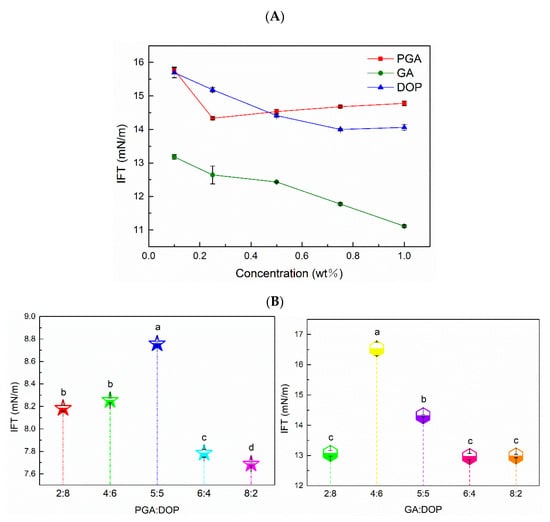 The interfacial properties of the emulsifier reflect its emulsion stabilizing property [10]. In Figure 2A, compared to the interfacial tension between coconut oil and water (23.46 mN/m) [6,41], the interfacial tension of the three polysaccharide aqueous solutions was significantly reduced. The interfacial tension of the polysaccharide solution decreased while increasing the concentration of the polysaccharide; previous studies that reported that the polysaccharide molecules were adsorbed on the oil–water interface agreed with the above observation [6,42,43]. Interestingly, the interfacial tension of PGA was the lowest at a concentration of 0.25%, and the interfacial tension of DOP was the lowest at a concentration of 0.75%, but the interfacial tension of GA continued to decrease within a concentration range of 0.1–1%. This phenomenon indicates that the adsorption amount at the oil–water interface gradually increases while increasing the concentration of the emulsifier, and when the adsorption amount is saturated, it reaches critical micellar concentration (CMC); at this time, the interfacial tension reaches a steady-state [44,45]. Furthermore, the ability of GA to reduce the interfacial tension was the best of the three polysaccharide forces, which was due to the low molecular weight of GA and the proteins in GA. Compared to large molecular polysaccharides, small molecular polysaccharides and surface hydrophobic proteins could be adsorbed to the oil–water interface faster [38,43]. In Figure 2B, the interfacial activity of the compound-polysaccharides mainly depended upon the contents of GA and PGA, which was the opposite to their apparent viscosities. The surface hydrophobicity of the compound-polysaccharides was mainly provided by PGA and GA, and for PGA:DOP = 8:2 and GA:DOP = 8:2, the compound polysaccharide exhibited the smallest interfacial tension. It is interesting, however, that when PGA:DOP = 5:5 and GA:DOP = 4:6, their interfacial tension was the largest. This shows that the value of interfacial tension does not change regularly with the proportion of PGA or GA in the complex polysaccharide. This might be when PGA:DOP or GA:DOP was in a certain ratio; the emulsifier molecules interacted with each other and led to reduced group exposure.