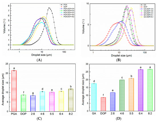(A) Particle size distribution of emulsions prepared by compounding polysaccharides of PGA and DOP as emulsifiers (total emulsifier concentration was 1 wt%); (B) Particle size distribution of emulsions prepared by compounding polysaccharides of GA and DOP as emulsifiers (total emulsifier concentration was 1 wt%); (C) The average particle size of emulsions prepared by compounding polysaccharides of PGA and DOP as emulsifiers (total emulsifier concentration was 1 wt%); (D) The average particle size of emulsions prepared by compounding polysaccharides of GA and DOP as emulsifiers (total emulsifier concentration was 1 wt%), a–g indicate significant differences (p < 0.01).