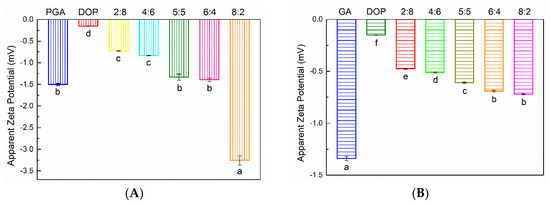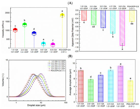 (A) The zeta potential of emulsions prepared by compounding polysaccharides of PGA and DOP as emulsifiers (total emulsifier concentration was 1 wt%); (B) The zeta potential of emulsions prepared by compounding polysaccharides of GA and DOP as emulsifiers (total emulsifier concentration was 1 wt%), a–f indicate significant differences (p < 0.01).