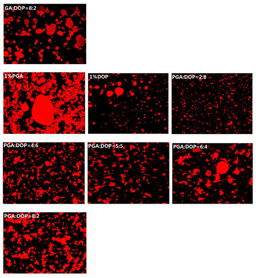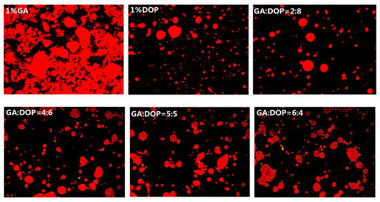 Figure 5 shows the microstructure of the emulsions under a fluorescence microscope. The emulsion prepared by 1% GA alone and the emulsion prepared by 1% PGA contained larger droplets and large amounts of aggregation, which agreed with their average particle size in Section 3.3. However, compared to the emulsion prepared by 1% GA alone or 1% PGA alone, the emulsion prepared by 1% DOP alone displayed more small-sized droplets and less aggregation. Two main types of repulsions prevent the aggregation of emulsion droplets: steric and electrostatic repulsion [38,48]. Polysaccharides can increase the viscosity of the aqueous phase and strengthen the steric repulsion of the emulsion [49]. The emulsion stabilized by DOP alone possessed the smallest zeta potential, but small droplets (from Section 3.4), indicating that the high viscosity of the DOP aqueous phase prevented the aggregation of the droplets. For the emulsion prepared by the compound polysaccharides, the microstructure of emulsions indicated that the droplet size and degree of aggregation of the emulsion were highly depended upon the ratio of PGA:DOP or GA:DOP. The higher the proportion of PGA or GA in the compound polysaccharide, the larger the emulsion droplets, and the more severe the aggregation of the emulsion droplets, suggesting that the viscosity was a crucial factor for maintaining the stability of the emulsion under this condition.