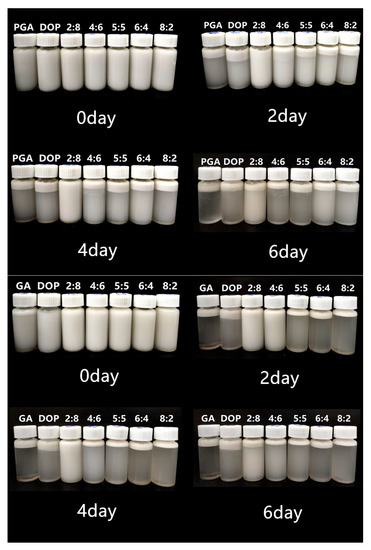 The visual observations of all emulsions are shown in Figure 6. The results of the visual observation were consistent with the results of the particle size distribution and microstructure. After four days of storage, significant phase separation occurred in all emulsions except those two emulsions prepared with PGA:DOP = 2:8 (1 wt%) or GA:DOP = 2:8 (1 wt%) as emulsifiers. After six days of storage, the two remaining emulsions also displayed phase separation. According to the above results, the repulsive effect in emulsions could not prevent the droplets from agglomerating during storage. Therefore, we adjusted the concentration and ratio of the compound polysaccharide emulsifier in our further research.