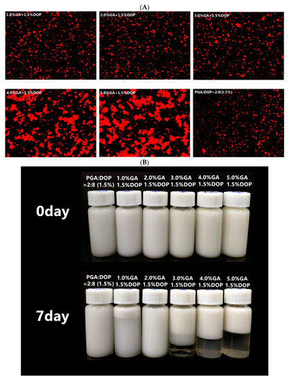 The microstructure and visual observation of the emulsions (Figure 8) were consistent with the particle size of the emulsions. The microstructure of all emulsions displayed small droplets, but the emulsions prepared by 4.0% GA + 1.5% DOP and the emulsions prepared by 5.0% GA + 1.5% DOP displayed many aggregated droplets, which was related to their lower viscosity. Additionally, extremely high concentrations of the emulsifier might flocculate numerous free (not adsorbed on the droplet surface) emulsifier molecules [38,48]. After seven days of storage, the emulsions prepared by PGA:DOP = 2:8 (total concentration = 1.5 wt%) and those prepared by 2.0% GA+1.5%DOP displayed good stability without phase separation.