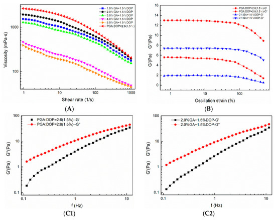 Rheological properties. (A) Steady-state flow curve. (B) Linear viscoelastic zone. (C1) Dynamic frequency sweep of the emulsion prepared by PGA: DOP=2:8 (1.5%); (C2) Dynamic frequency sweep of the emulsion prepared by 2.0% GA + 1.5% DOP.