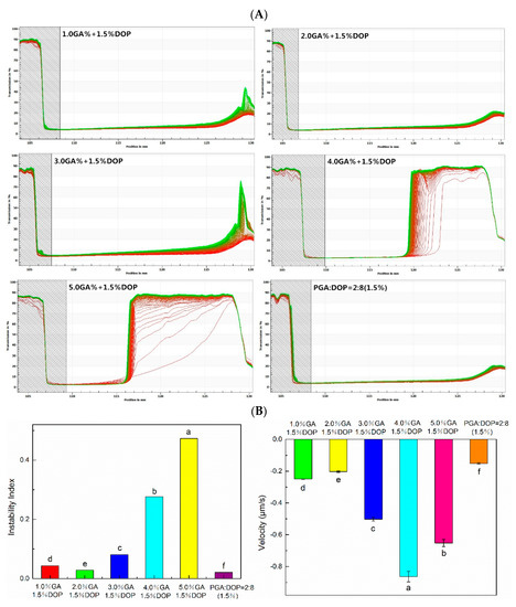 The physical stability analysis was a space-related and time-related transmission profile over the sample length and the greater change in the transmission with centrifugation, the worse stability of the emulsion [27,58]. In Figure 10A, the transmission curves of all emulsions showed a floating phenomenon (creaming). The transmission curves of the emulsions prepared by 4.0% GA + 1.5% DOP and 5.0% GA + 1.5% DOP were changed significantly, and the transmittance of the two emulsion samples finally exceeded 90%. The transmission curves of the emulsions prepared by PGA:DOP = 2:8 (total concentration = 1.5 wt%) and those prepared by 2.0% GA +1.5% DOP did not change substantially during the test, which indicated that the two emulsions possessed high physical stability. The analytical range of the sample was selected from the meniscus to the bottom to calculate the instability index of the emulsion samples. The speed index of the interface tracking was calculated during the creaming process for a threshold of 16%. In Figure 10B, the emulsions prepared by PGA:DOP = 2:8 (total concentration = 1.5 wt%) and those prepared by 2.0% GA + 1.5% DOP exhibited a lower instability index and smaller speed of interface movement, compared to other emulsion samples. This result was closely related to the viscosity of the emulsion. The high-viscosity continuous phase limited the aggregation of droplets and the movement of molecules. The molecular movement resistance was large, the speed was slow, and macroscopically, the interface movement speed was small.