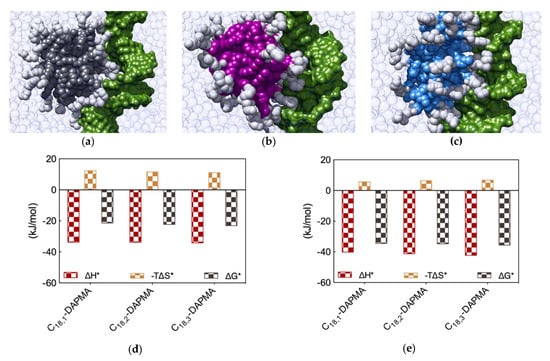 When considering DNA binding, simulation results highlight an interesting feature: the enthalpic gain for the three different SAMul micelles upon interaction with the nucleic acid is almost constant and equal to ∆H* = −33.77, −33.81, and −34.15 kJ/mol for C18,1-DAPMA, C18,2-DAPMA, and C18,3-DAPMA, respectively (Figure 5e). Thus, in absolute terms, the small difference in effective binding enthalpy between the micelles formed by the least and the most unsaturated SAMul micelle (0.38 kJ/mol) is in stark contrast with what observed in the case of heparin binding, where the same difference amounts to 9.04 kJ/mol (Figure 5d). Also, the entropic component is decidedly less subjected to variation when these three micelles are placed in contact with DNA, the difference between C18,1-DAPMA and C18,3-DAPMA being again limited to 1.3 kJ/mol (Figure 5e) while, for heparin, it is almost this value is almost the double (3.3 kJ/mol, Figure 5d). As a result, the values of DG* for the DNA binding by these three SAMul micelles are definitely less sensitive to each SAMul molecular structure and, in agreement with their corresponding experimental CE50 values, they rank the affinity of the micelles for the polyanion in the order C18,3-DAPMA > C18,2-DAPMA > C18,1-DAPMA (∆G* = −23.07, −22.27, and −21.43 kJ/mol, respectively, Figure 5e).