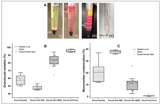 Purity and contaminant analysis of granulocyte isolation comparing the four methods of isolation. (A) Images at the end of each isolation method: (i) method I—Percoll with different gradients, (ii) method II—Percoll with phosphate buffer solution (PBS), (iii) method III—Percoll with Hank’s balanced salt solution (HBSS) and (iv) method IV—Percoll and Ficoll. (B) Boxplot of the purity of the granulocyte isolation between methods. (C) Boxplot of the contamination of granulocyte isolations between methods. Abbreviations Gra: granulocytes.