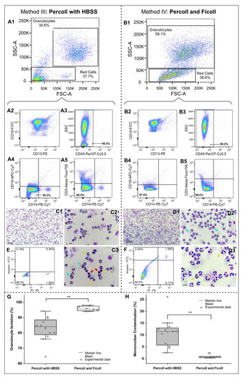 Analysis of the purity of isolated granulocytes and their morphological appearance (fast panoptic) between isolation methods III and IV. (A1,B1) Forward-scatter (FSC) vs. side-scatter (SSC) plots represent the isolated neutrophil population. Neutrophils isolated by methods III and IV were labeled with a mixture of antibodies and analyzed for the expression of (A2,B2) CD15 and CD13, (A3,B3) CD45 (as positive markers) and (A4,B4) CD19 and CD14 and (A5,B5) CD3 and CD14 (as negative markers). (C1–3,D1–3) Fast panoptic staining represents the morphological differences between neutrophils (indicated by the yellow arrows), contaminants (indicated by the red arrow) and the other granulocytes (indicated by blue arrows) under 10×, 20× and 40×. (E,F) Cell viability analysis by Annexin-FITC and propidium iodine-phycoerythrin (PI-PE). (G) Boxplot of the isolated granulocyte purity analysis for different methods. (H) Boxplot of the mononuclear contamination analysis for different methods. Representative pictures are shown from more than 10 slides analyzed.