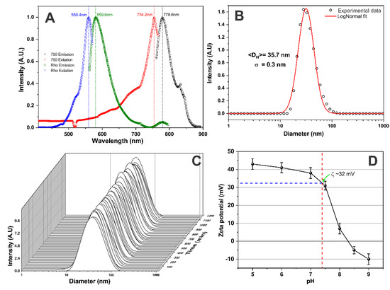 M-SPION characterizations: (A) M-SPION excitation/emission spectrum, showing the double fluorescence. (B) The curve of M-SPION size polydispersion. (C) The temporal stability analysis of M-SPIONs dispersed in culture medium (DMEM with 10% FBS). (D) Zeta potential as a function of the pH of the M-SPION solution.
