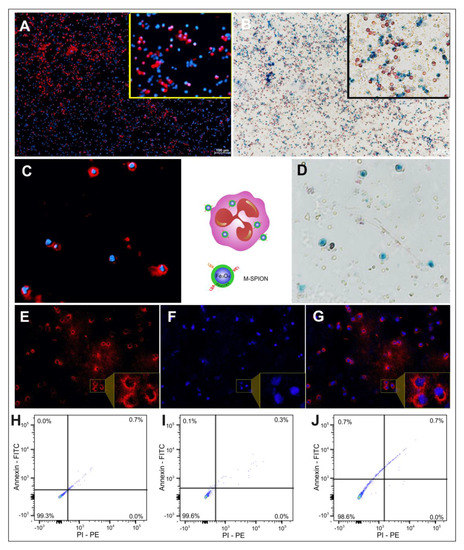 Fluorescence and brightfield microscopy and the viability of granulocytes labeled with M-SPIONs. (A) Fluorescence microscopy image of granulocytes labeled with M-SPIONs (4x). (B) Brightfield microscopy image of the granulocytes labeled with M-SPIONs and stained with Nuclear Fast Red and Prussian blue (4x) (C,D) Images corresponding to the same field of view of the granulocytes labeled with M-SPIONs by fluorescence and brightfield microscopy (4x). (E) Rhodamine imaged by fluorescence microscopy. (F) The corresponding image of granulocyte nuclear staining by DAPI. (G) Merged images of rhodamine/DAPI. The inset images (A,B,E–G) correspond to the amplified view of a selected area.(H–J) Viability was evaluated with M-SPION concentrations of 10, 30 and 50 μg Fe/mL respectively, with double negativity for Annexin-FITC and PI-PE.