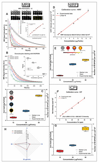 The quantification of M-SPIONs internalization into granulocytes. (A) MRI of the phantom containing different M-SPION concentrations and graph demonstrating the transverse relaxation curves of the signal intensity MRI as a function of echo time for M-SPION concentrations of 5, 10, 15, 20, 25, 30, 35, 40 and 50 µg Fe/mL. The inset image shows the r2 value determined from the linear adjustment of inverse transverse relaxation time as a function of iron concentration. (B) The graph of the signal intensity of MRI as a function of echo time for the samples of granulocytes labeled with M-SPION concentrations of 10, 30 and 50 µg Fe/mL. The inset shows the boxplot of the T2 value as a function of iron concentration used in each sample. (C) The boxplot of the iron load quantified by the MRI of the granulocytes labeled with M-SPION concentrations of 10, 30 and 50 µg Fe/mL in pg Fe per cell and number of M-SPIONs/cell. (D) The graph of the calibration curve of the signal intensity of near-infrared fluorescence (NIRF) as a function of iron concentration (µg Fe/mL), with the experimental data, the linear fit line and the equation used for the adjustment. (E) The boxplot of the iron load quantified by NIRF of the granulocytes labeled with M-SPION concentrations of 10, 30 and 50 µg Fe/mL in pg Fe/cell and the number of M-SPIONs/cell, calculated from the NIRF calibration curve. (F) The calibration curve of inductively coupled plasma mass spectrometry (ICP-MS), showing the net intensity (cps) as a function of iron concentration (ppb). The experimental data showed a linear fit. (G) The boxplot of the iron load quantified by ICP-MS of the granulocytes labeled with M-SPION concentrations of 10, 30 and 50 µg Fe/mL in pg Fe/cell and the number of M-SPIONs/cell. (H) Radar graph of the iron load quantified by MRI, NIRF and ICP-MS of granulocytes labeled with M-SPION concentrations of 10, 30 and 50 µg Fe/mL in pg Fe/cell.