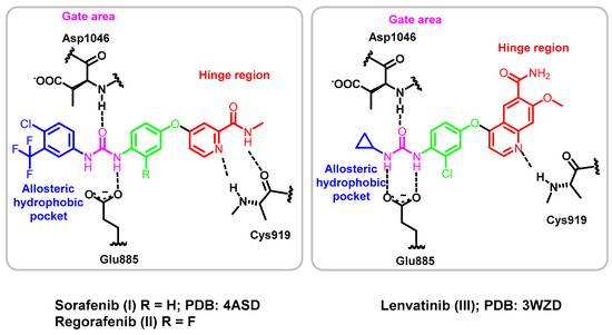 The structure of type II inhibitors, e.g., sorafenib (I; PDB 4ASD) [26], regorafenib (II) and lenvatinib (III; 3WZD) [12], were found to share common pharmacophoric features, which are (1) a hinge region binding moiety “head”, which is a heterocycle that occupies the adenine region in the ATP binding pocket with H bond donor and/or acceptor capabilities to interact with Cys919 (colored red in Figure 2); (2) a “linker”, which is a segment of three to four chemical bonds that extends over the gatekeeper residue (colored green in Figure 2); (3) a hydrogen-bonding moiety that is required to achieve hydrogen bond interaction with the Asp1046 in the conserved DFG motif and Glu885 of the αC helix (colored purple in Figure 2) and (4) a “tail” segment typically consisting of a hydrophobic moiety that occupies the allosteric hydrophobic back pocket created by the DFG-out flip (colored blue in Figure 2) [10,27,28].