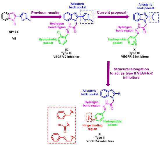 Motivated by these previous findings, our group has recently reported the design, synthesis and antiproliferative activity of novel 2-furylbenzimidazole derivatives [17]. They were designed through structural optimization of the known VEGFR-2 inhibitor NP184 (VII), e.g., compound IX (Figure 4). The designed molecules successfully showed promising VEGFR-2 inhibitory activity in comparison to their parent compound NP184 (VII). In silico, molecular docking simulations showed that the 2-furylbenzimidazole scaffold occupies the allosteric hydrophobic back pocket, while the chain in position one of the benzimidazole moiety extends to the gate area stabilizing the molecule through two hydrogen bonds with the key amino acids Glu885 and Asp1046, achieving VEGFR-2 inhibition in a type III inhibitor-like binding mode [17,47].