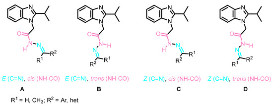The structures of all Schiff bases 13a–h and 14a–d were unambiguously elucidated by NMR spectroscopy, as well as by X-ray crystal structure analysis of two representative derivatives: 13c and 14a. Analysis of the 1HNMR and 13CNMR spectra of the obtained Schiff bases showed the duplication of signals which was rationalized to the presence of either E/Z geometrical isomers around the C=N or cis/trans conformers on the CO-NH (Figure 5) [48]. However, it was reported that the N-acylhydrazones that results from the reaction between hydrazides and aromatic aldehydes favor the sterically less-hindered geometric E isomers A, B [49,50,51]. This result was also confirmed by our X-ray study (Figure 6 and Figure 7). Therefore, the duplication of signals was rationalized to the presence of a mixture of E,cis A and E,trans B conformers in different ratios in the NMR solvent (Figure 5) (for further details, see experimental part and SI).