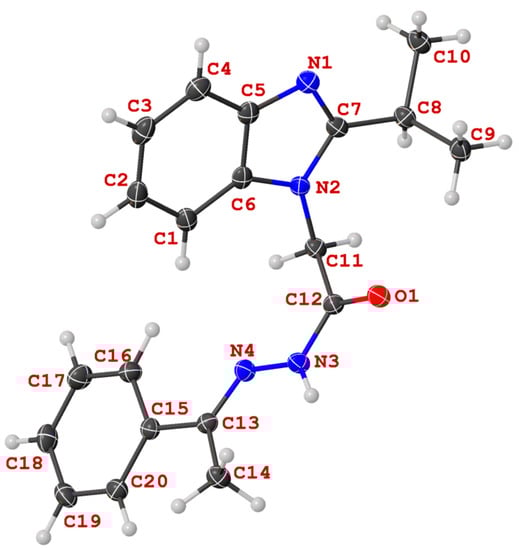 View of the structure of (N′-(-1-phenylethylidene)-2-(2-(propan-2-yl)-1H-benzimidazol-1-yl)acetohydrazide (14a) in the crystal.