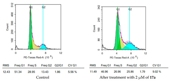 Based on the promising antiproliferative activity and antiangiogenic activity of series 17, compound 17a was further assayed for its effect on the cell cycle distribution by flow cytometric analyses of propidium iodide-stained nuclei at 2 µM. Cell cycle parameters were compared for HepG2 cells with DMSO as control and after treatment with 17a and incubation for 48 h, and the results were depicted in Figure 8. From the obtained results, it is obvious that there is a decrease in the percent of cell distribution in the G1 phase, from 51.34% in control to 46.96% in treated cells, and an increase in the percent of cells accumulated in the G2 phase, from 13.43% in the control to 25.86% in the treated cells. This result indicated that compound 17a arrests the cell cycle at the G2/M phase.