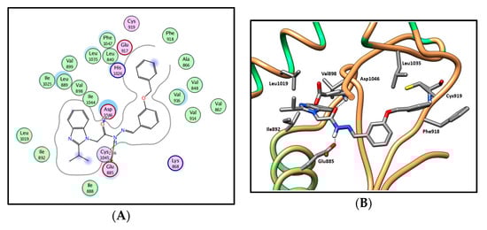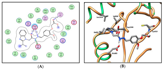 In silico molecular docking results of series 13a–h and 14a–d, which exhibit 2-isopropyl moiety at the two position, displayed the previously reported general predicted binding pattern of the 1-substituted-2-furylbenzimidazole, e.g., IX [17]. This binding pattern involves the accommodation of the 2-substituted benzimidazole moiety in the allosteric hydrophobic back pocket and its stabilization through hydrophobic interactions with the hydrophobic side chains of Ile888, Leu889, Ile892, Val898, Val899, Leu1019 and Ile1044 (Figure 10; for further details, see SI). The hydrazide-hydrazone moiety in series 13a–h and 14a–d is involved in hydrogen-bonding interactions with the side chain carboxylate of Glu885 of the αC helix and/or with Asp1046 in the conserved DFG motif. This binding pattern directs the (un)substituted phenyl moiety towards the hydrophobic gate area, resulting in hydrophobic interactions with the hydrophobic side chains of Val848, Lys868, Leu889, Val916 and Phe1047, which enhances the interactions in a type III inhibitor’s binding manner.