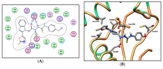 2D diagram (A) and 3D representation (B) of compound 13d showing its interaction with the VEGFR-2 active site.