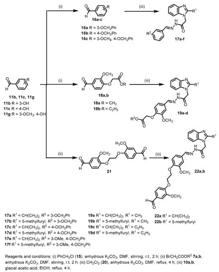 For the synthesis of the target compounds 17a–f, 3-hydroxybenzaldehyde (11b), 4-hydroxybenzaldehyde (11c) or vanillin (11g) was reacted with benzyl chloride (15) to afford the corresponding benzyloxybenzaldehydes 16a–c. Subsequently, the acetohydrazides 10a,b were reacted with the intermediates 16a–c under acid catalyzed conditions to yield the corresponding Schiff bases 17a–f (Scheme 3). In a similar way, vanillin (11g) was reacted with methyl bromoacetate (7a), ethyl bromoacetate (7b) or dichloroethane (20) under basic conditions to afford the corresponding intermediates 18a,b and 21, respectively. Reaction of the acetohydrazides 10a,b with the intermediates 18a,b or 21 in ethanol in the presence of catalytic amounts of acetic acid afforded the target compounds 19a–d and 22a,b, respectively (Scheme 3). The resulting target compounds 17a–f, 19a–d and 22a,b were found to exist in a mixture of two conformers in the solution state (1H NMR and 13C NMR).