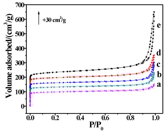 N2 sorption isotherms of the (a) H-FER-0, (b) H-FER-0.015, (c) H-FER-0.03, (d) H-FER-0.06, and (e) H-FER-0.12 samples, respectively.